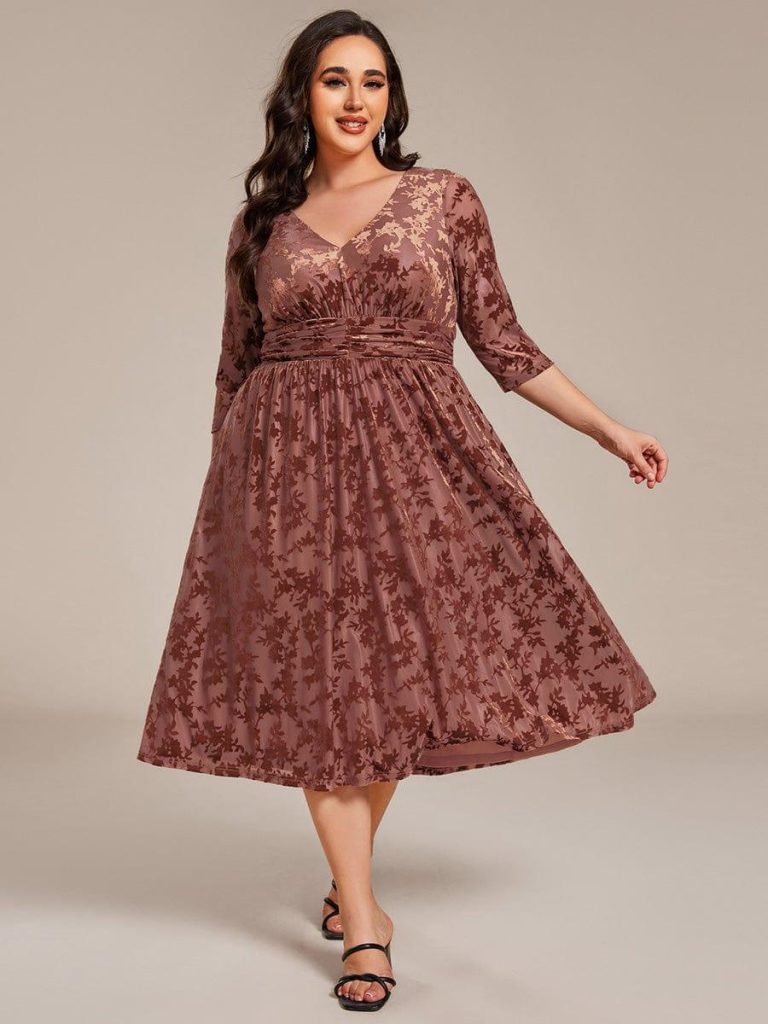 Plus Size Chiffon Short Sleeves Pleated V-Neck A-Line Midi Wedding Guest Dress